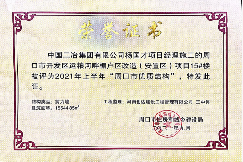 10月14日,由中國(guó)二冶新型建筑分公司承建施工的周口市運(yùn)糧河畔棚戶區(qū)改造(安置區(qū))項(xiàng)目15#樓被評(píng)為2021年上半年“周口市優(yōu)質(zhì)結(jié)構(gòu)”工程獎(jiǎng)。