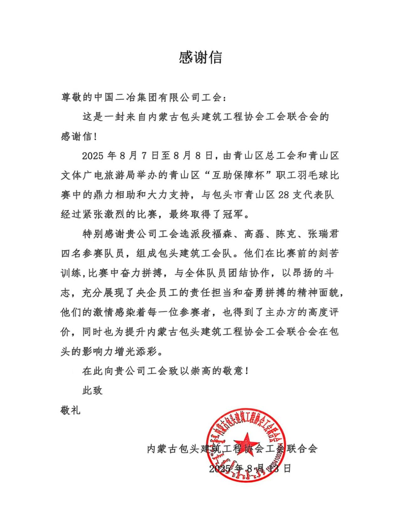 感謝信最后,內(nèi)蒙古包頭建筑協(xié)會(huì)再次對(duì)中國(guó)二冶工會(huì)的鼎力相助和大力支持表示感謝,同時(shí)致以崇高的敬意!